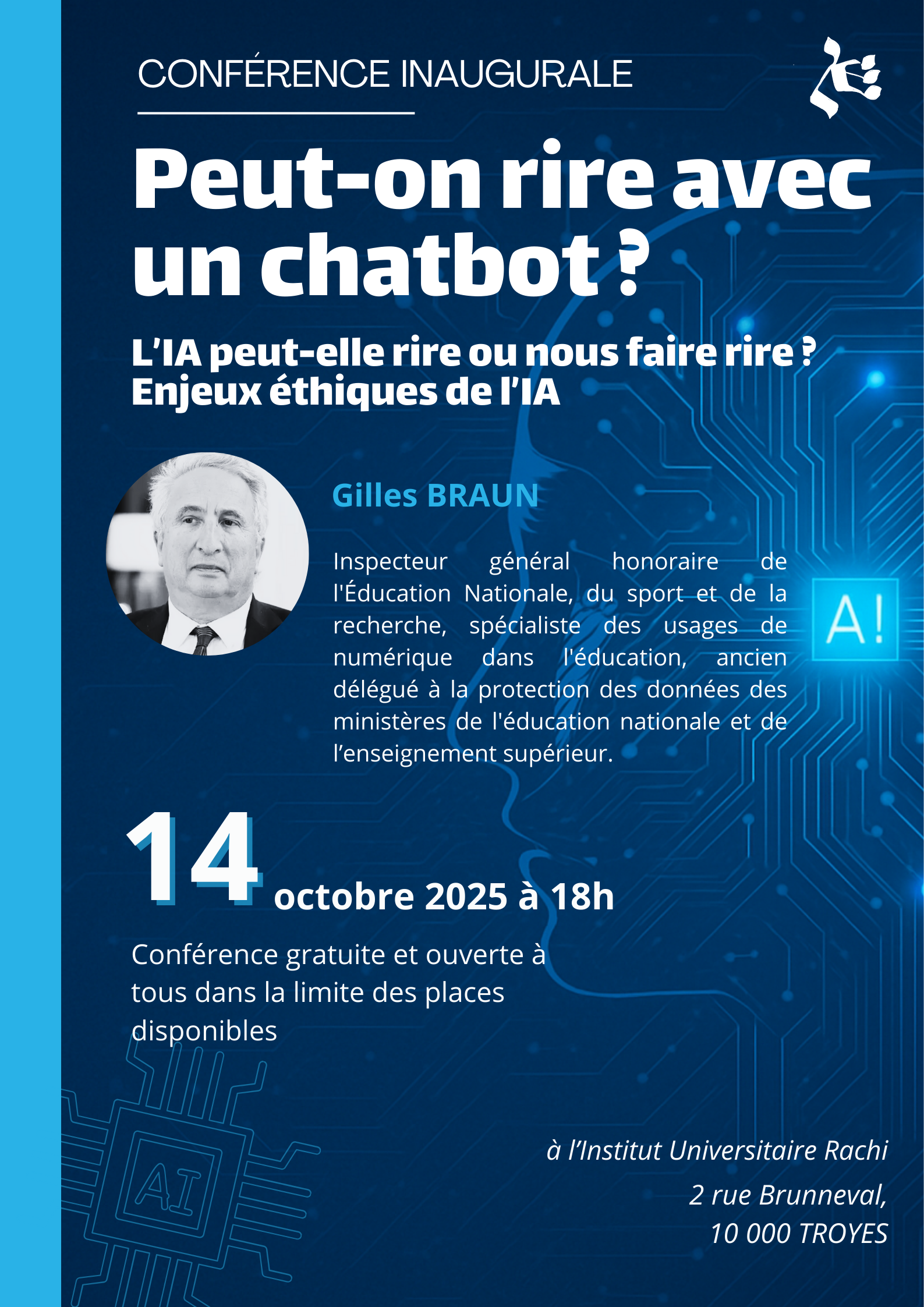 « Peut-on rire avec un chatbot ? L’IA peut-elle rire ou nous faire rire ? Enjeux éthiques de l’IA » par Gilles BRAUN, le 14 octobre à 18h à l’Institut Universitaire Rachi.