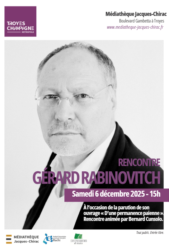 25 novembre 2025Non classéAdministrateur Le 6 décembre à 15h, en partenariat avec la Médiathèque Jacques-Chirac, l’Institut vous invite à participer à la rencontre avec Gérard RABINOVITCH à l’occasion de la parution récente de son ouvrage.