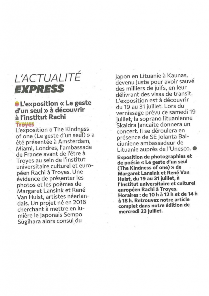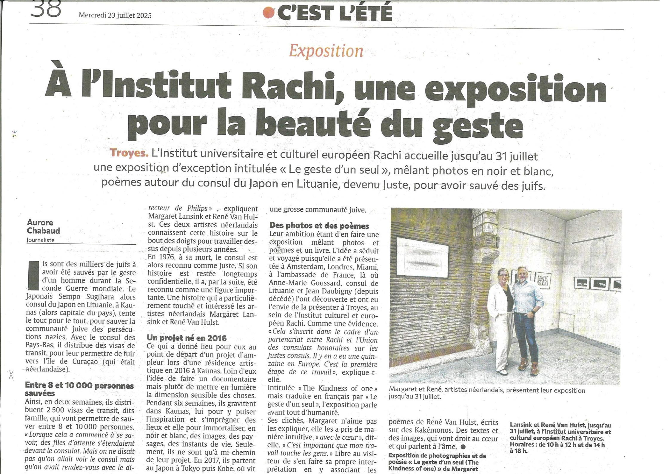 Parution dans l’Est Eclair pour le vernissage de l’exposition « The Kindness of one » – juillet 2025