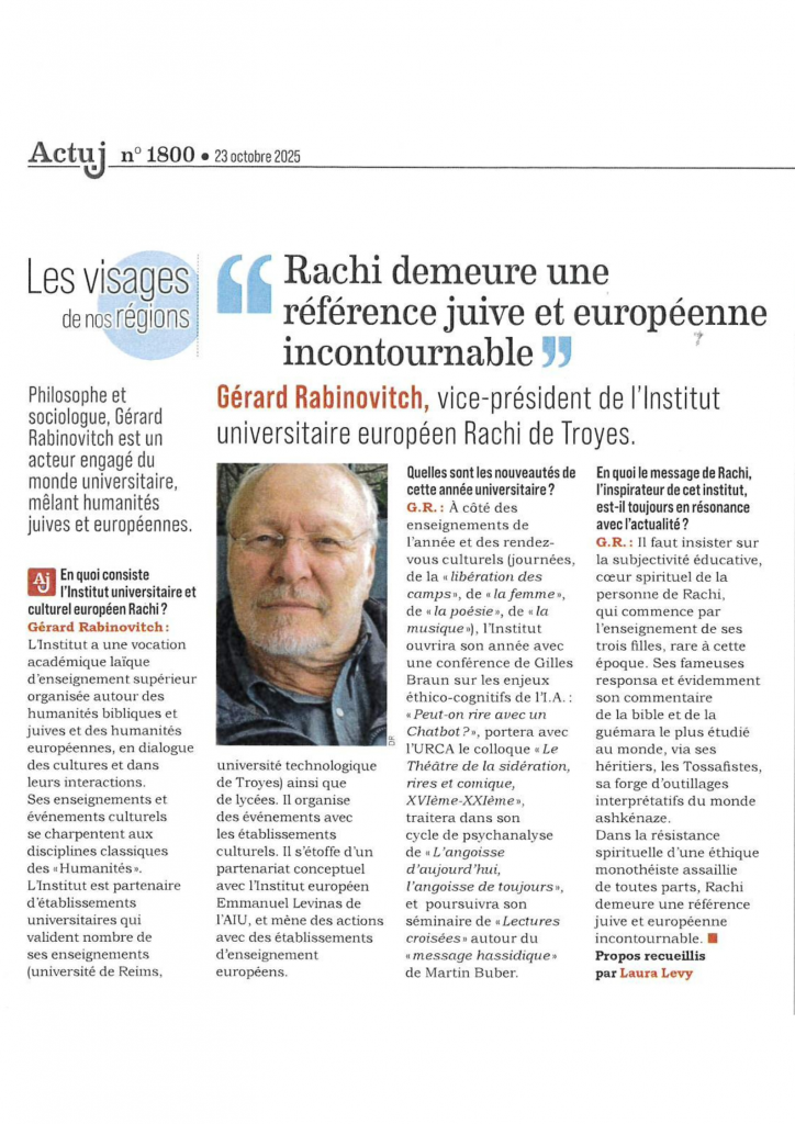 Parution dans Actu J sur le témoignage de Gérard Rabinovitch à propos de l’Institut Universitaire Rachi